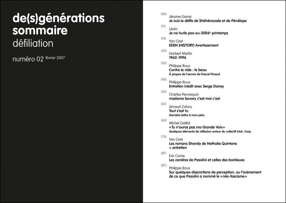 Yan Ciret, Pascal Pinaud, Serge Daney, Charles Pennequin, Jérôme Game, AAA. Corp., Nathalie Quintane, Eric Corne, Michel Gaillot