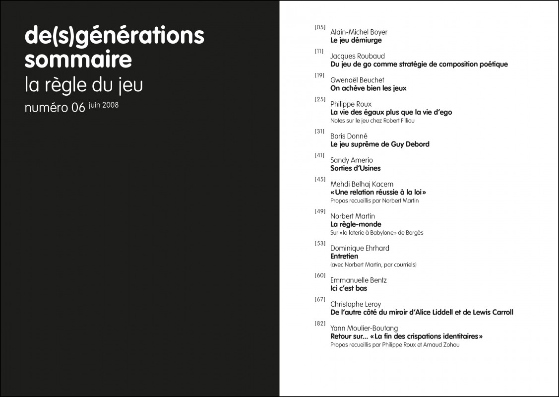 Sandy Amerio, Mehdi Belhaj Kacem, Emmanuelle Bentz, Gwenaël Beuchet, Alain-Michel Boyer, Boris Donné, Dominique Ehrhard, Christophe Leroy, Yann Moulier-Boutang, Jacques Roubaud