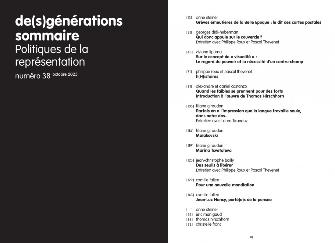 Jean-Christophe Bailly, Alexandre Costanzo, Daniel Costanzo, Georges Didi Huberman, Camille Fallen, Christelle Franc, Lillane Giraudon, Thomas Hirschhorn, Viviana Lipuma, Éric Manigaud, Anne Steiner.