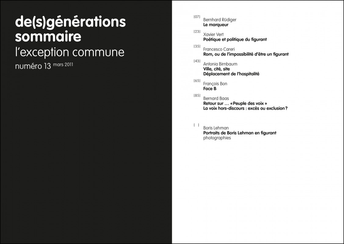 Bernard Baas, Antonia Birnbaum, François Bon, Francesco Careri, Boris Lehman, Bernhard Rüdiger, Xavier Vert