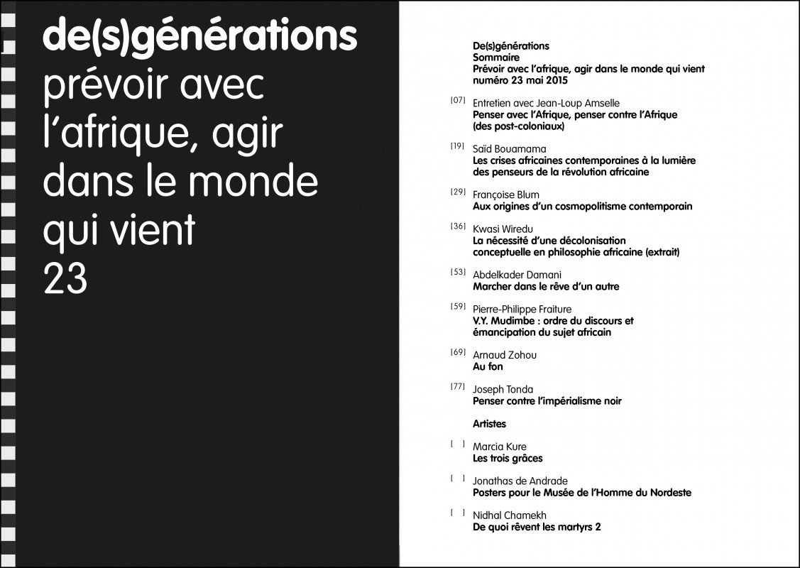 Jean-Loup Amselle, Jonathas de Andrade, Françoise Blum, Saïd Bouamama, Nidhal Chamekh, Abdelkader Damani, Pierre-Philippe Fraiture, Marcia Kure, Joseph Tonda, Kwasi Wiredu, Arnaud Zohou