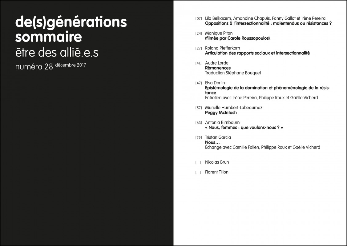 Antonia Birnbaum, Nicolas Brun, Elsa Dorlin, Tristan Garcia, Audre Lorde, Peggy McIntosh, Roland Pfefferkorn, Monique Piton, Florent Tillon, Lila BelKacem, Amandine Chapuis, Fanny Gallot, Irène Pereira