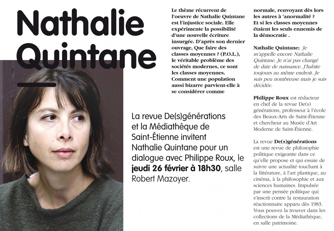 La revue De(s)générations et la Médiathèque de Saint-Étienne invitent Nathalie Quintane.