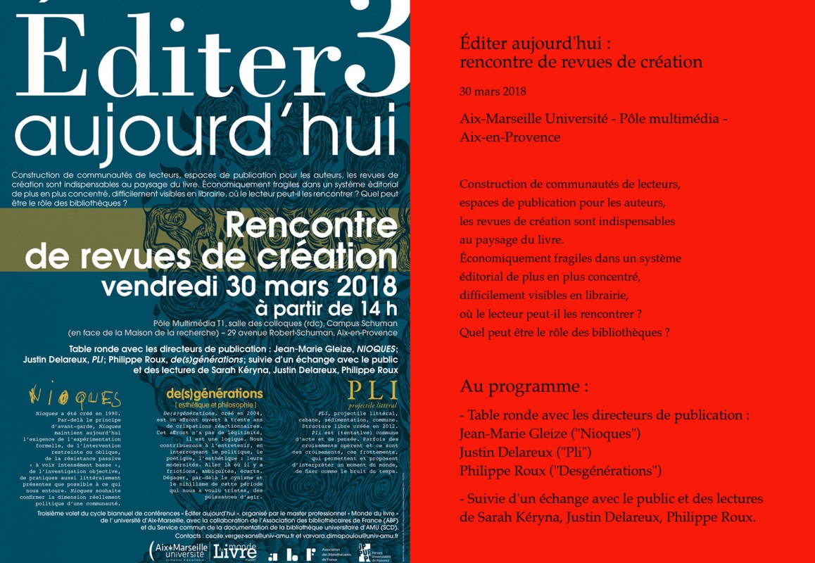 Rencontre de revues de création. Table ronde avec Jean-Marie Gleize (Nioques), Justin Delareux (Pli), Philippe Roux (De(s)générations), suivie de lectures de Sarah Kéryna, Justin Delareux.