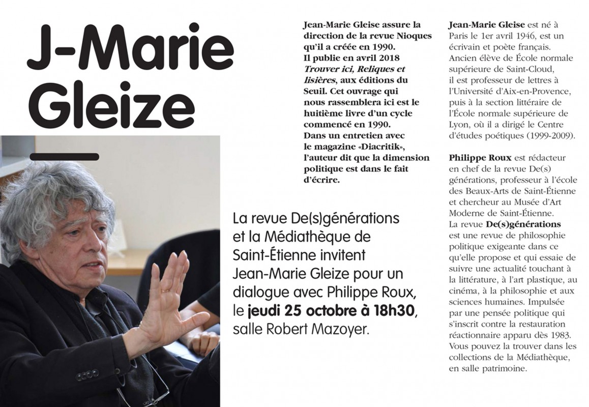 Rencontre avec Jean-Marie Gleize, médiation assurée par la revue De(s)générations à la Médiathèque de Tarentaize.