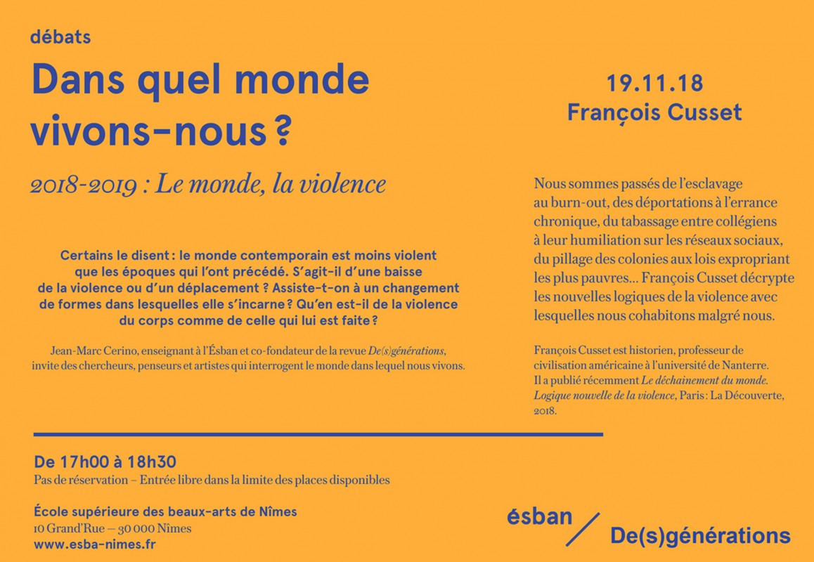 Rencontre avec François Cusset et Jean-Marc Cerino à l’ESBAN de Nîmes dans le cadre du cycle Dans quel monde vivons-nous ?