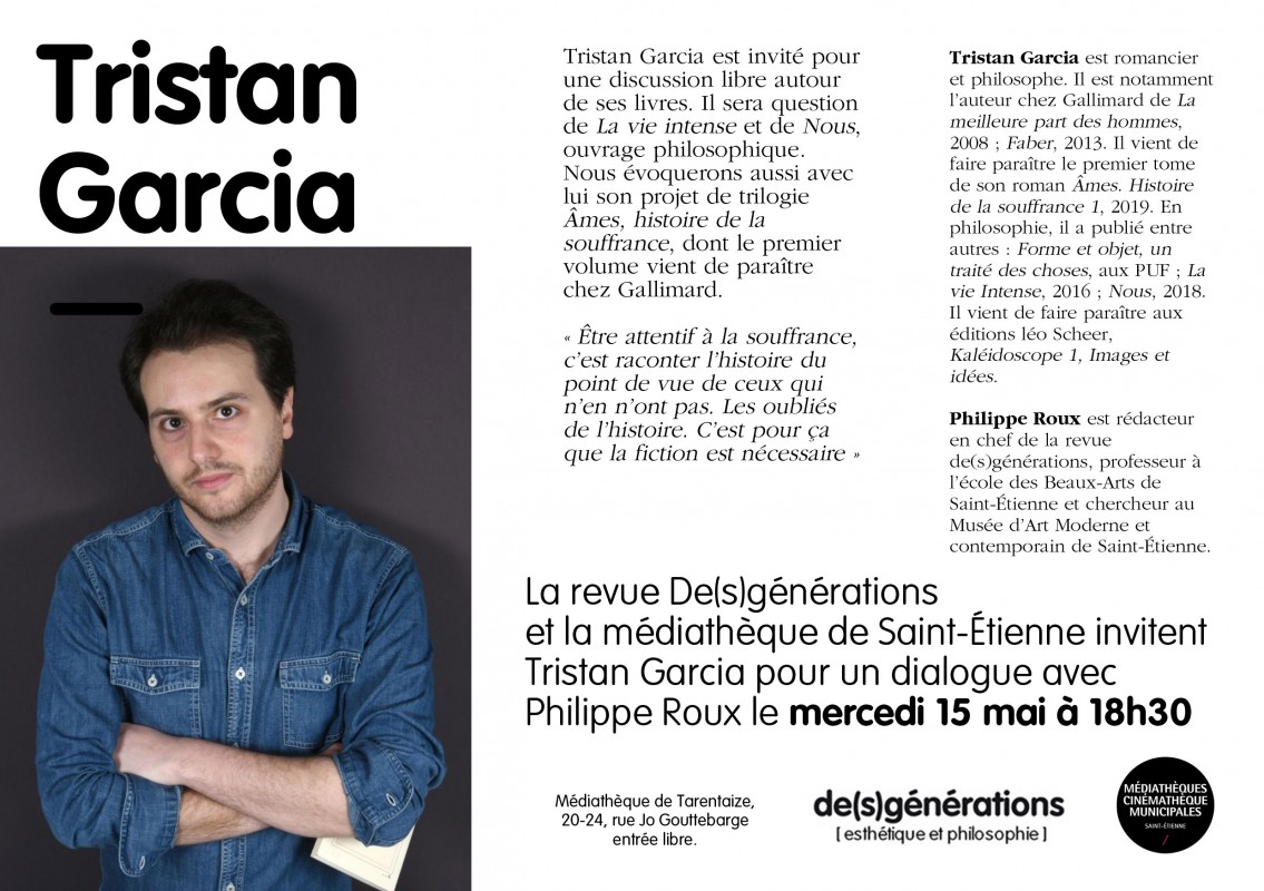 La revue De(s)générations et la médiathèque de Saint-Étienne invitent Tristan Garcia pour un dialogue avec Philippe Roux.