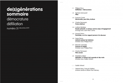 Les articles regroupent des informations sur les auteur.es des différents numéros de de(s)générations ainsi que sur les événements liés à la revue et aux membres de son comité de rédaction.