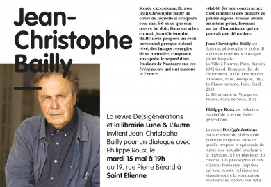 La revue De(s)générations et la librairie Lune & L’Autre invitent Jean-Christophe Bailly pour un dialogue avec Philippe Roux.