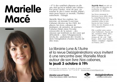 La revue De(s)générations et la librairie Lune & L'autre invitent Marielle Macé pour un dialogue avec Philippe Roux.