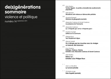 Alors, au-delà de l’ordre des discours induisant une sensibilité et une visibilité, la « violence » témoigne avant tout d’un malaise sur lequel s’édifie la logique de la souveraineté et désigne finalement le lieu d’une dispute qui porte sur ce qu’est le « réel » de la politique ou le sens même de la « démocratie ». C’est ce thème que l’on souhaitait proposer là où il s’articule à la politique mais aussi tout simplement comme pensée : car toute pensée ne fait-elle pas violence à un certain ordre des choses ou du monde ?