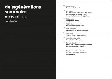 Par leur densité, leur extension, leur structure interne, leur modalité de développement, mais également par choix ou non-choix politiques, les villes contemporaines entretiennent en leur sein comme en leur périphérie des espaces d’exclusion. Cette politique de rejet, ces espaces de relégation et ces populations mises au ban font l’objet de ce numéro. Nous poursuivons ainsi les réflexions ouvertes par les numéros 12, Peuple des voix et 13, L’exception commune, notamment avec les textes de Christiane Cavallin Carlut : « Réalités et fictions du témoignage dans la demande d’asile : la construction de la crédibilité », de Sylvain George : « De la destruction de la démultiplication des mondes », de Francesco Careri : « Rom, ou de l’impossibilité d’être un figurant » ou d’Antonia Birnbaum : « Ville, cité, site. Déplacement de l’hospitalité ».