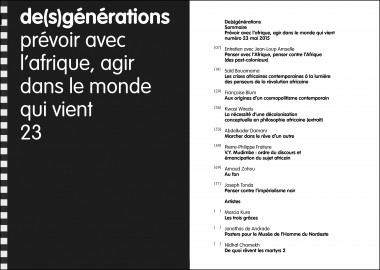 Le titre de ce second numéro autour de l’Afrique semble proposer une lecture plus politique et prospective de notre sujet, par rapport au premier qui serait davantage historique et philosophique. Ne nous y trompons pas. Dans les deux livraisons, ces éléments s’imbriquent. Et leur parution simultanée indique notre volonté de tisser ces différentes dimensions.